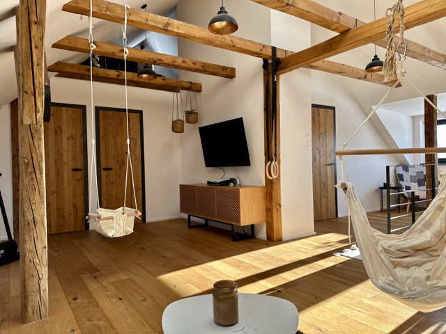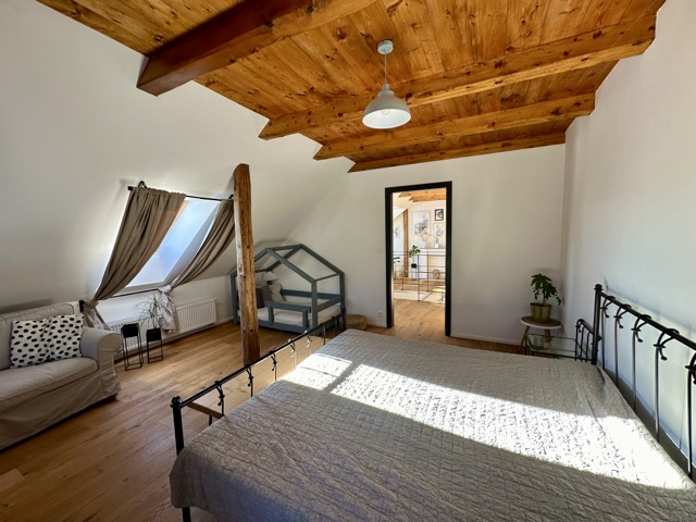 V patře jsou čtyři samostatné pokoje přístupné z horního obývacího pokoje otevřeného až do krovu, šatna, koupelna s vanou i sprchovým koutem a samostatné WC. V koupelně je podlahové topení. Podlahovou krytinu v patře tvoří třívrstvá lepená dubová podlaha a dlažba. Z obývacího prostoru je také vstup na oba půdní prostory.